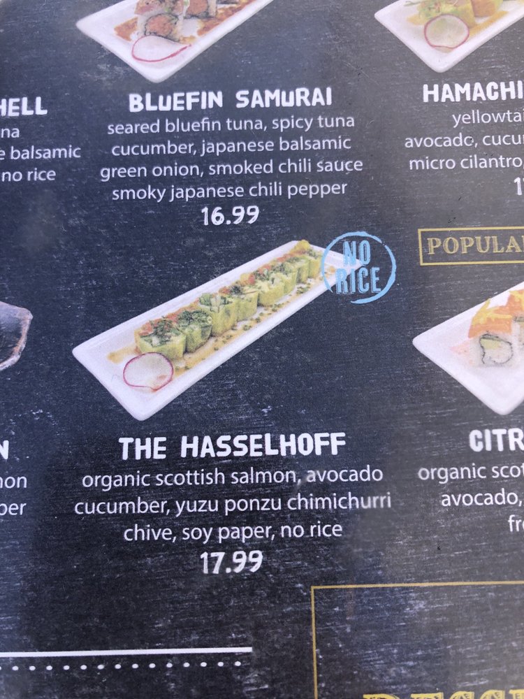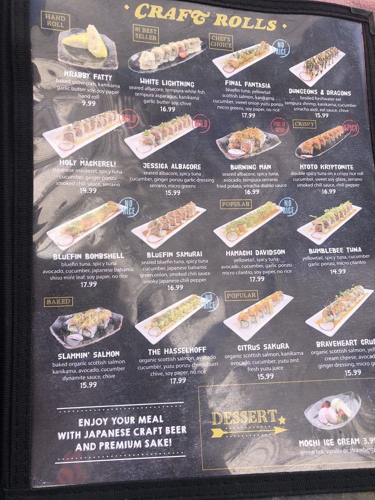 POPULAR NO RICE ROLL! No Rice Roll with Soy Paper, yellowtail, spicy tuna, avocado, cucumber, garlic ponzu, baby cilantro