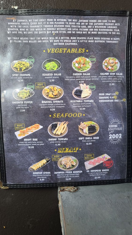 Japonica - Hermosa Beach offers a unique fusion of ramen and sushi bar cuisine in a casual, trendy, and intimate setting. This restaurant caters to various dietary needs, providing soy-free, vegan, and vegetarian options. Located at 1314 Hermosa Ave, Hermosa Beach, CA, Japonica also offers delivery, takeout, and catering services. The menu features creative dishes like Crispy Rice with spicy tuna and Shrimp Tempura, as well as a range of flavorful salads and seafood options. Customers praise the friendly staff, enjoyable atmosphere, and unique dishes like the smoked soy sauce. Overall, Japonica - Hermosa Beach provides a welcoming dining experience with a diverse menu that can satisfy all taste preferences.